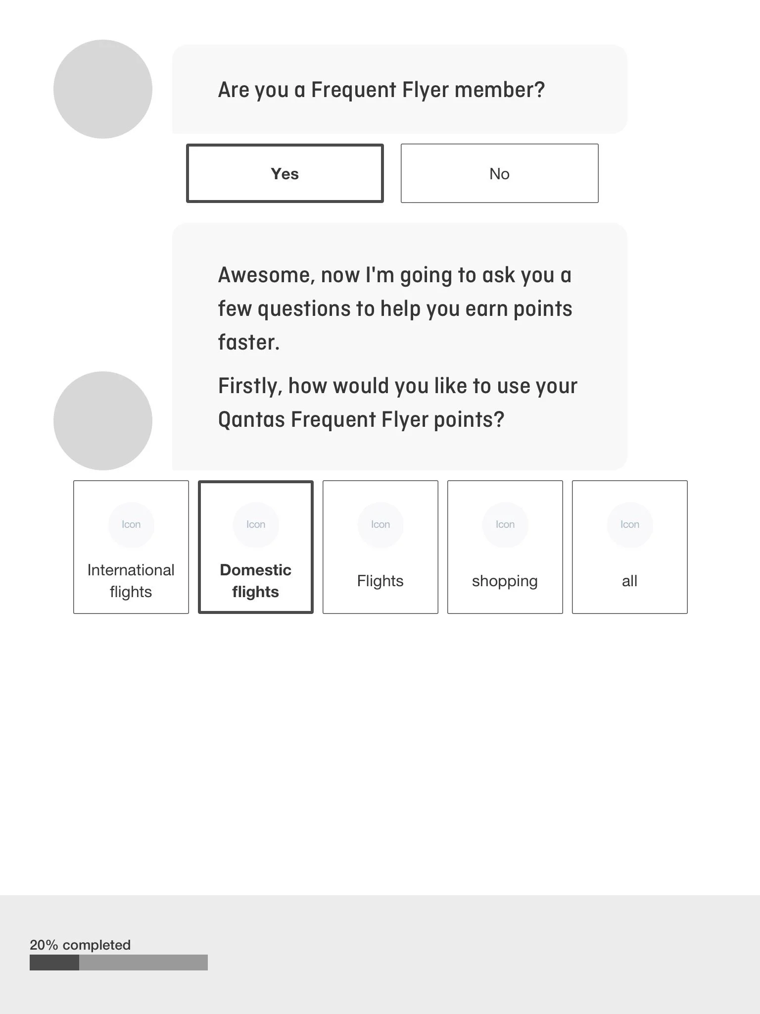Wireframe example for customers who aren't Frequent Flyer members, we pose a question from a Qantas business partner to introduce them to the brand and provide information on how they can earn points.